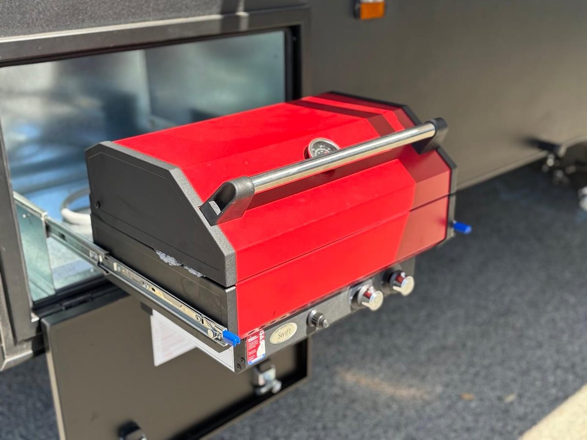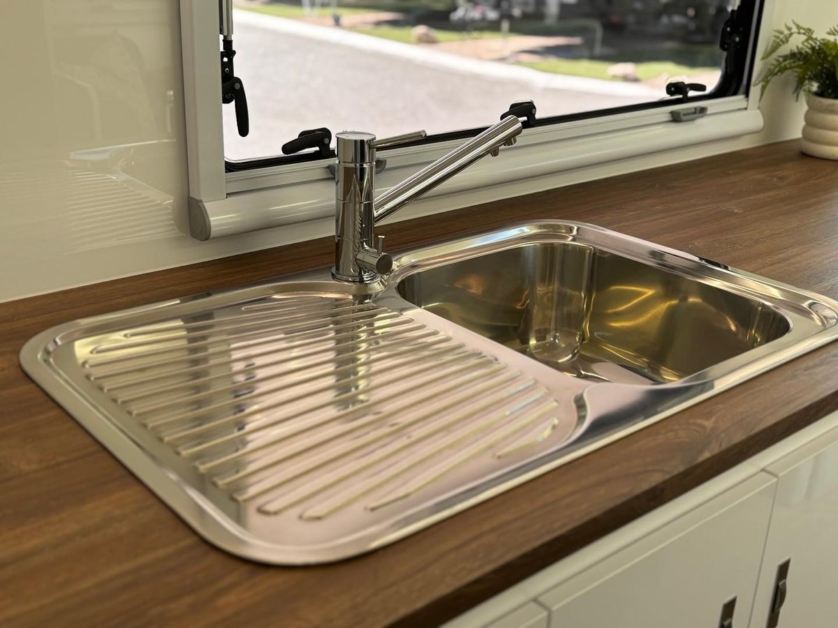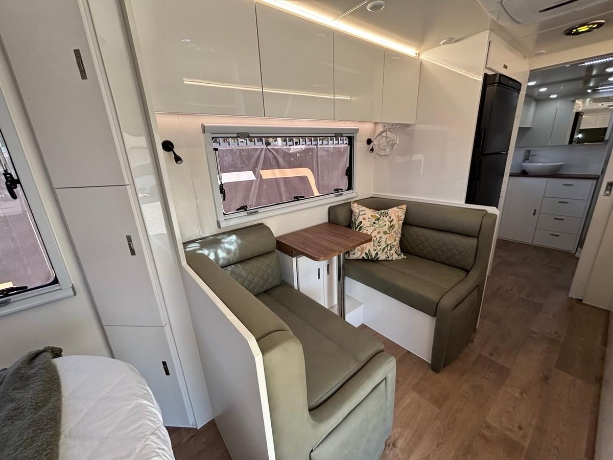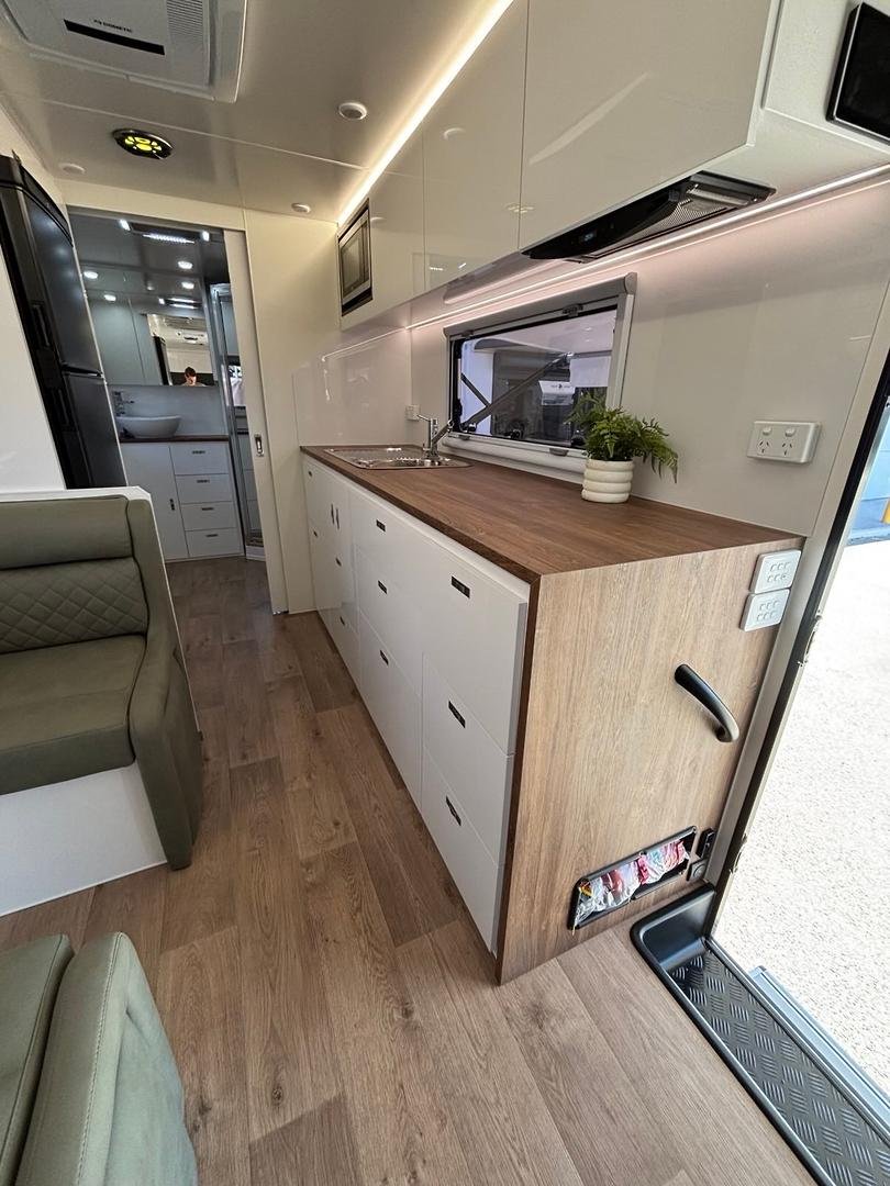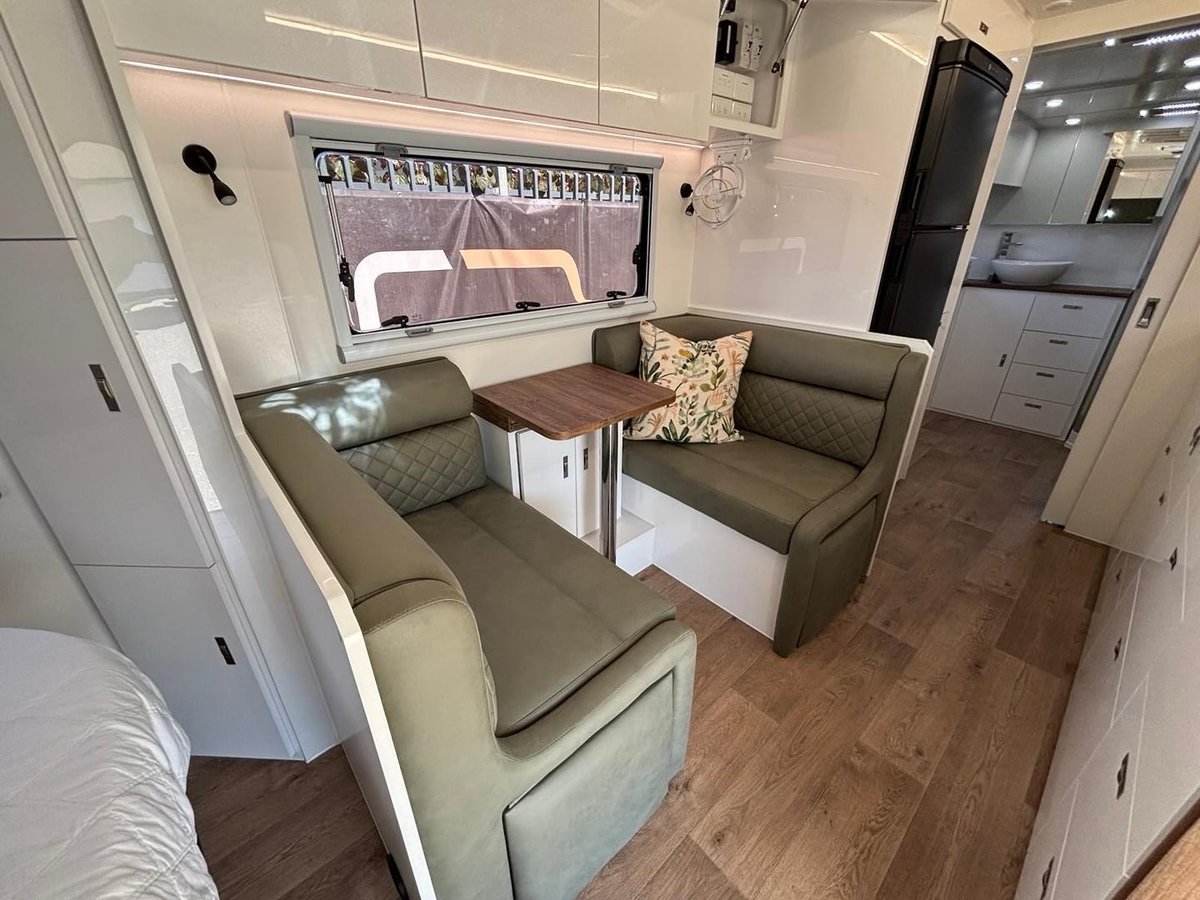 Every inch of this van has been thoughtfully crafted—from brushed silver handles to luxurious full-height cabinetry in matching metallic white. It’s not just a caravan. It’s a mobile lifestyle built for adventure in complete comfort.