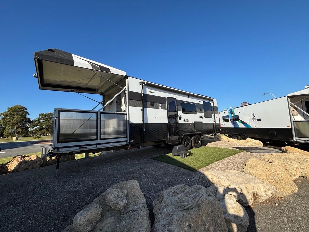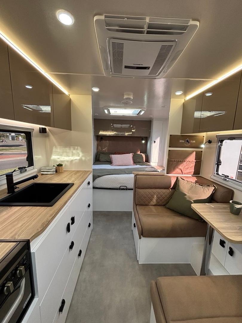 Step into luxury and innovation with the Royal Flair Piazza 21' - 1, designed to redefine what it means to explore Australia in style. With its extended deck, café-style seating, and off-grid capabilities, this 21-foot caravan brings modern sophistication and robust functionality to the road.