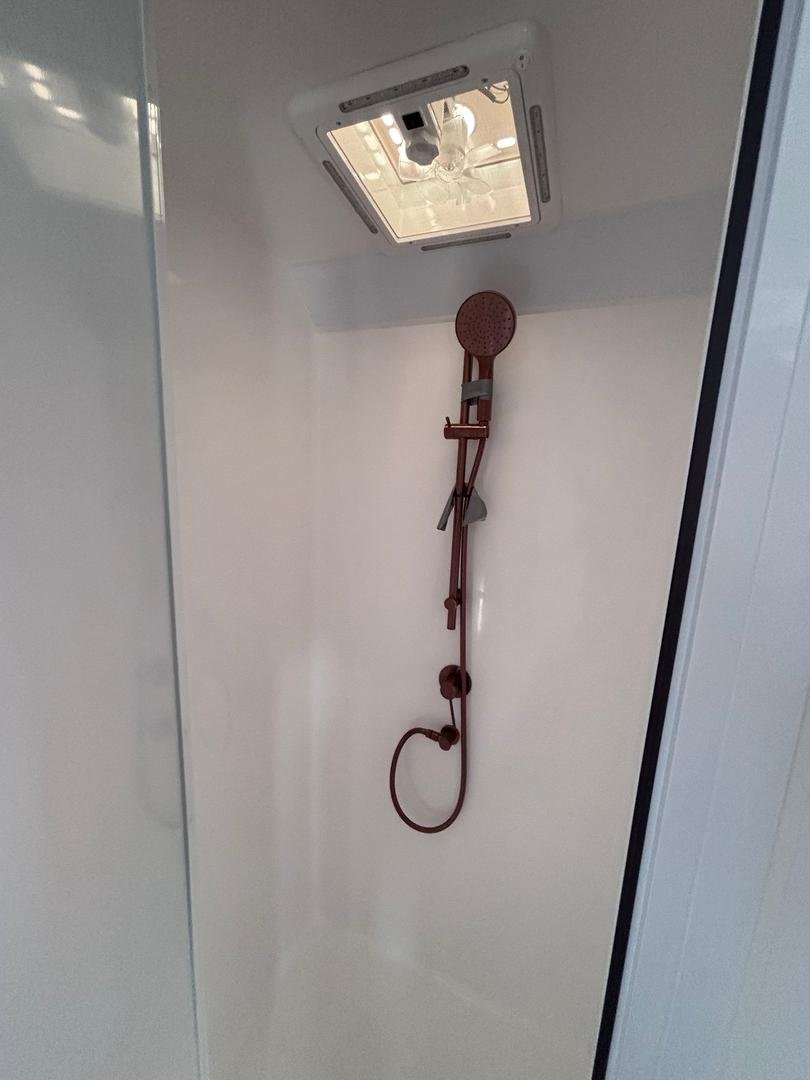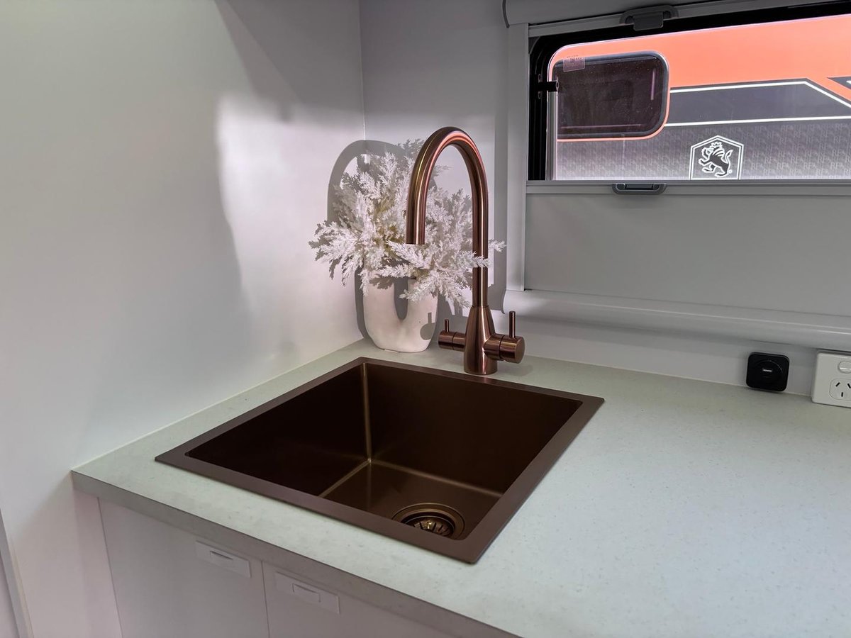 Soft, modern interiors in warm tan upholstery, matte white cabinetry and brushed copper finishes create a calm, contemporary home you’ll love coming back to each night. Whether it’s rainy days inside or long evenings under the awning, this van is built for memory-making.